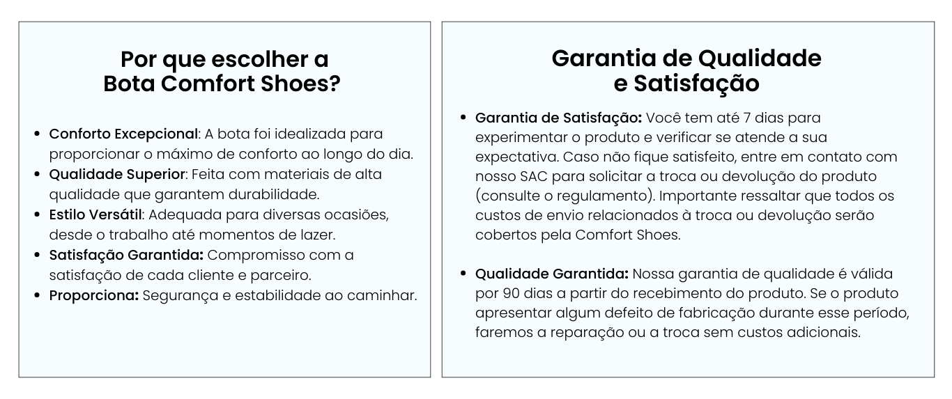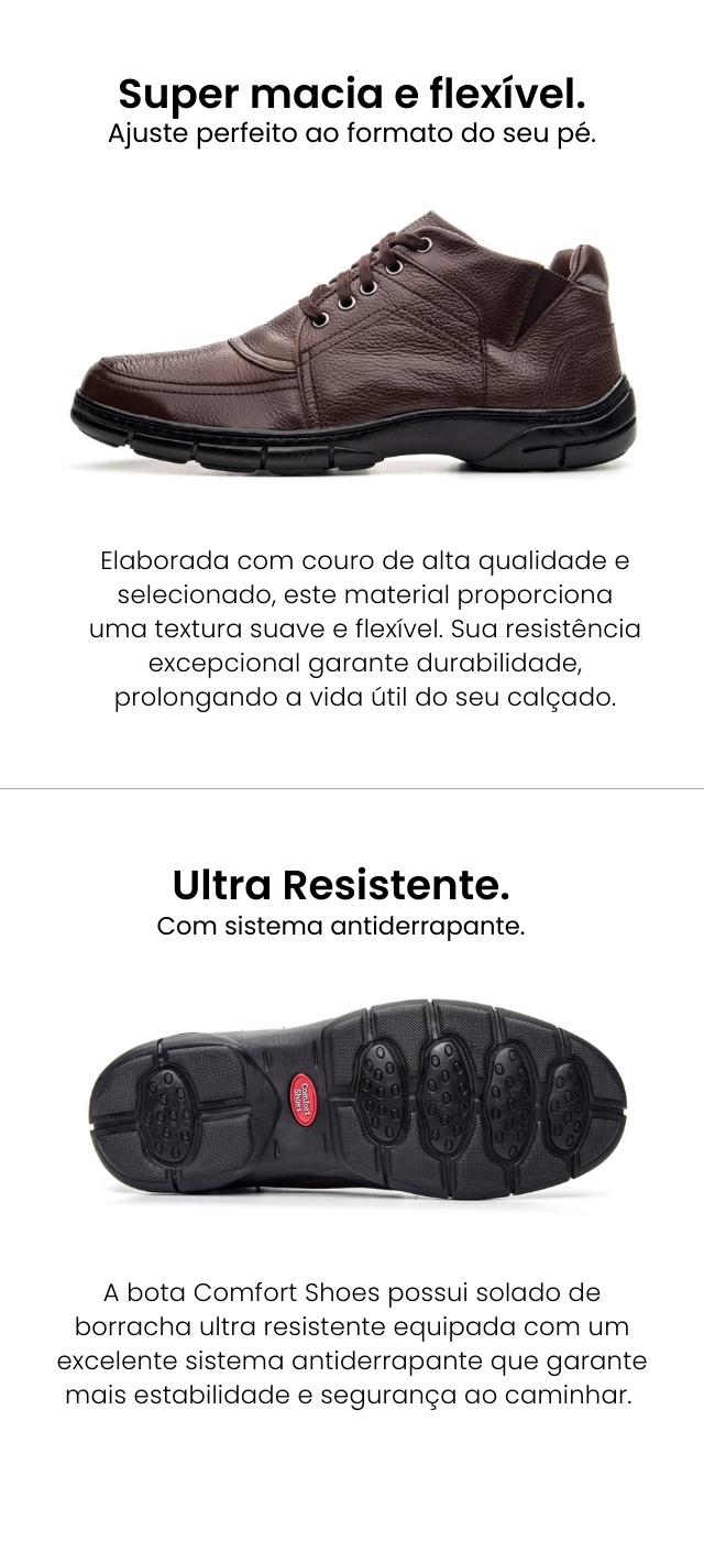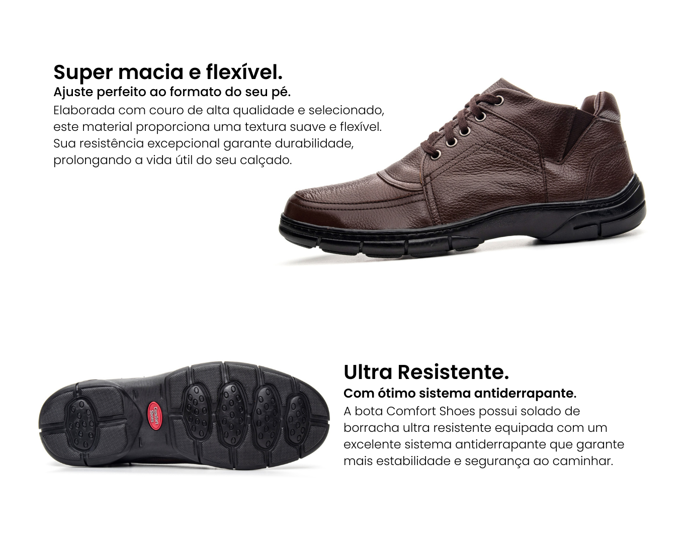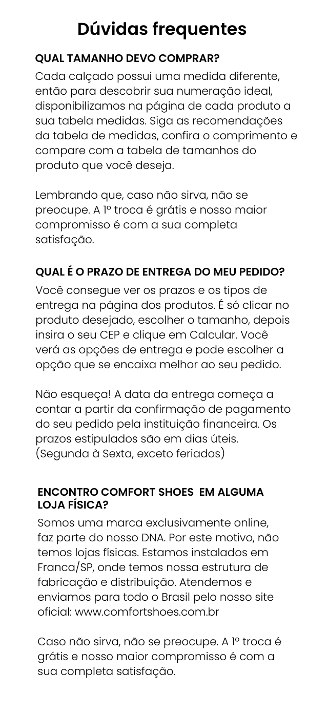 A Comfort Shoes é uma marca focada em oferecer calçados confortáveis e com qualidade Premium. Oferecemos produtos direto da fábrica, produzidos com matérias primas selecionadas e de extrema qualidade. Parcelamos sua compra em até 6x sem juros e enviamos para todo Brasil. Aproveite para fazer sua compra agora! Qualquer dúvida pode nos contatar em nossas centrais de atendimento!