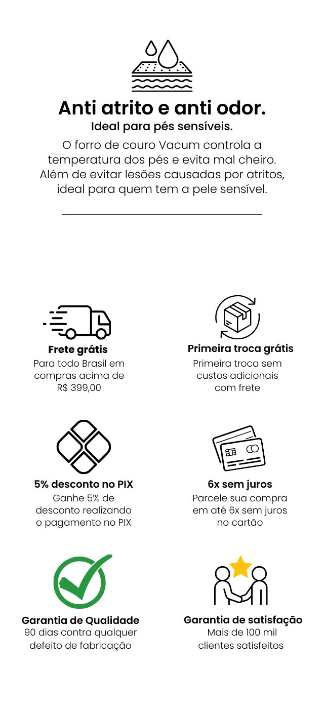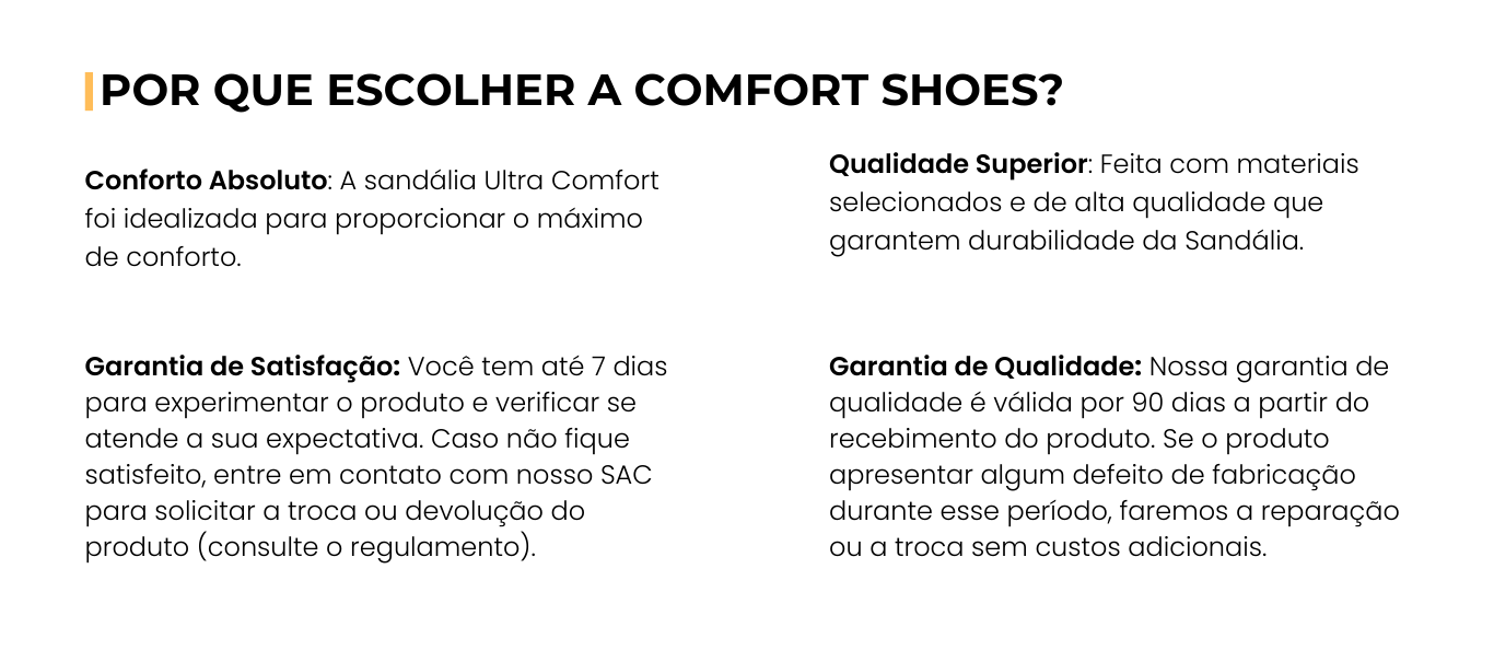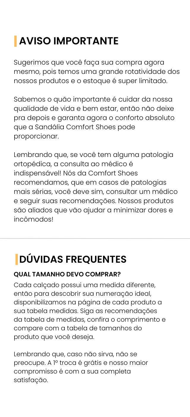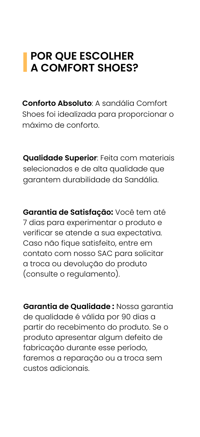 A Comfort Shoes é uma marca focada em oferecer calçados confortáveis e com qualidade Premium. Oferecemos produtos direto da fábrica, produzidos com matérias primas selecionadas e de extrema qualidade. Parcelamos sua compra em até 6x sem juros e enviamos para todo Brasil. Aproveite para fazer sua compra agora! Qualquer dúvida pode nos contatar em nossas centrais de atendimento!