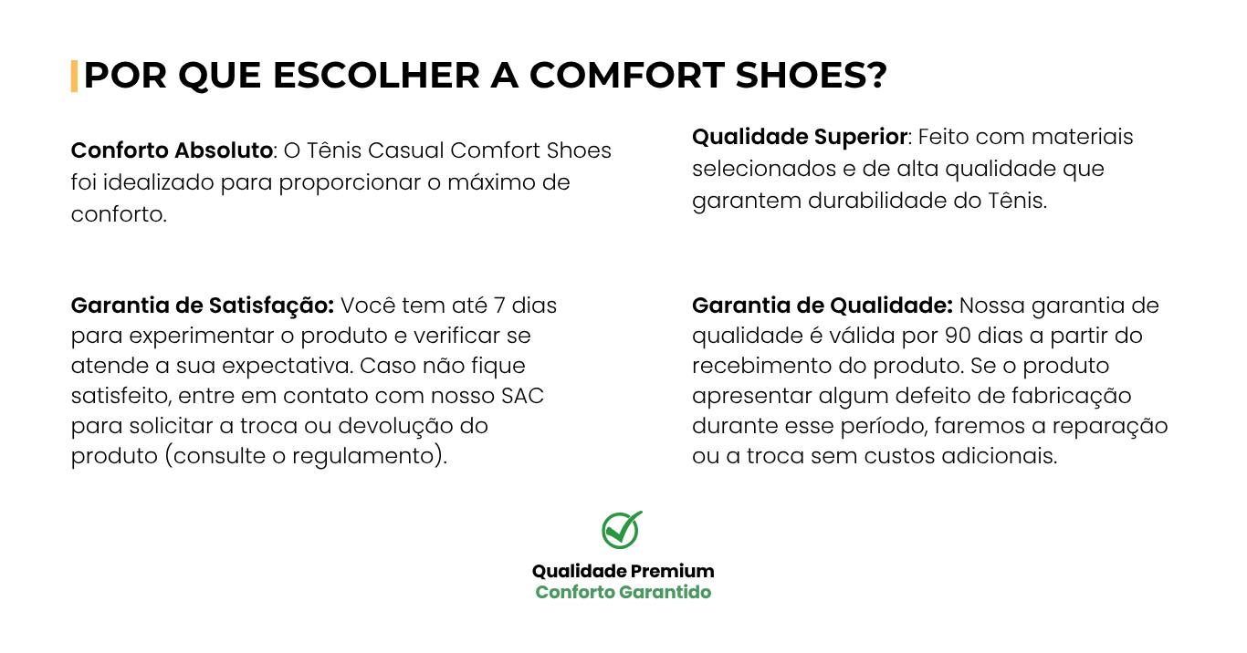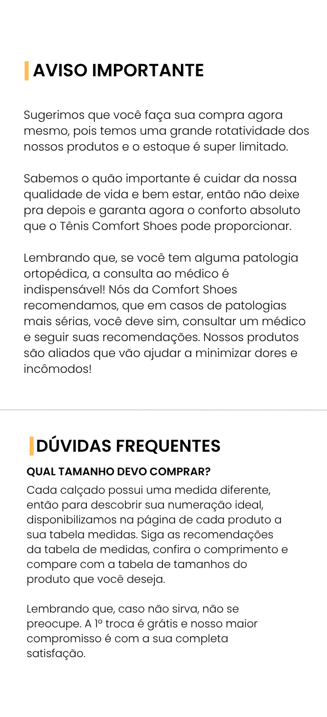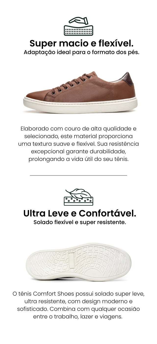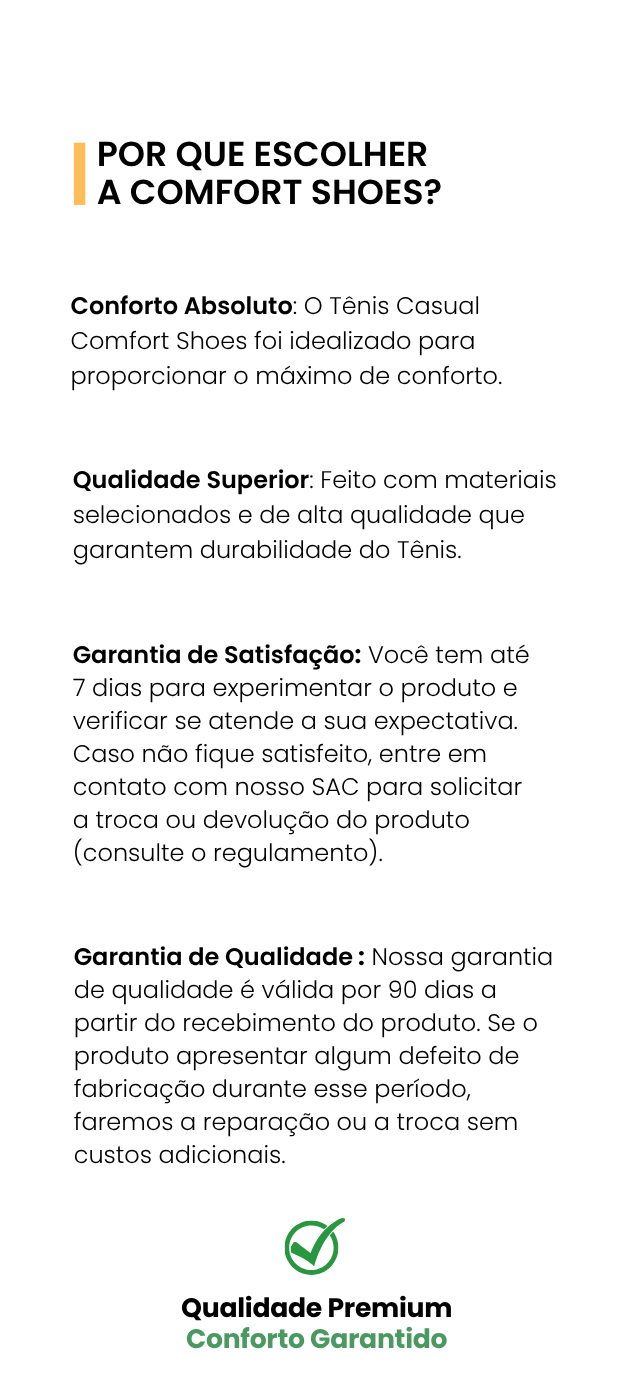 A Comfort Shoes é uma marca focada em oferecer calçados confortáveis e com qualidade Premium. Oferecemos produtos direto da fábrica, produzidos com matérias primas selecionadas e de extrema qualidade. Parcelamos sua compra em até 6x sem juros e enviamos para todo Brasil. Aproveite para fazer sua compra agora! Qualquer dúvida pode nos contatar em nossas centrais de atendimento!