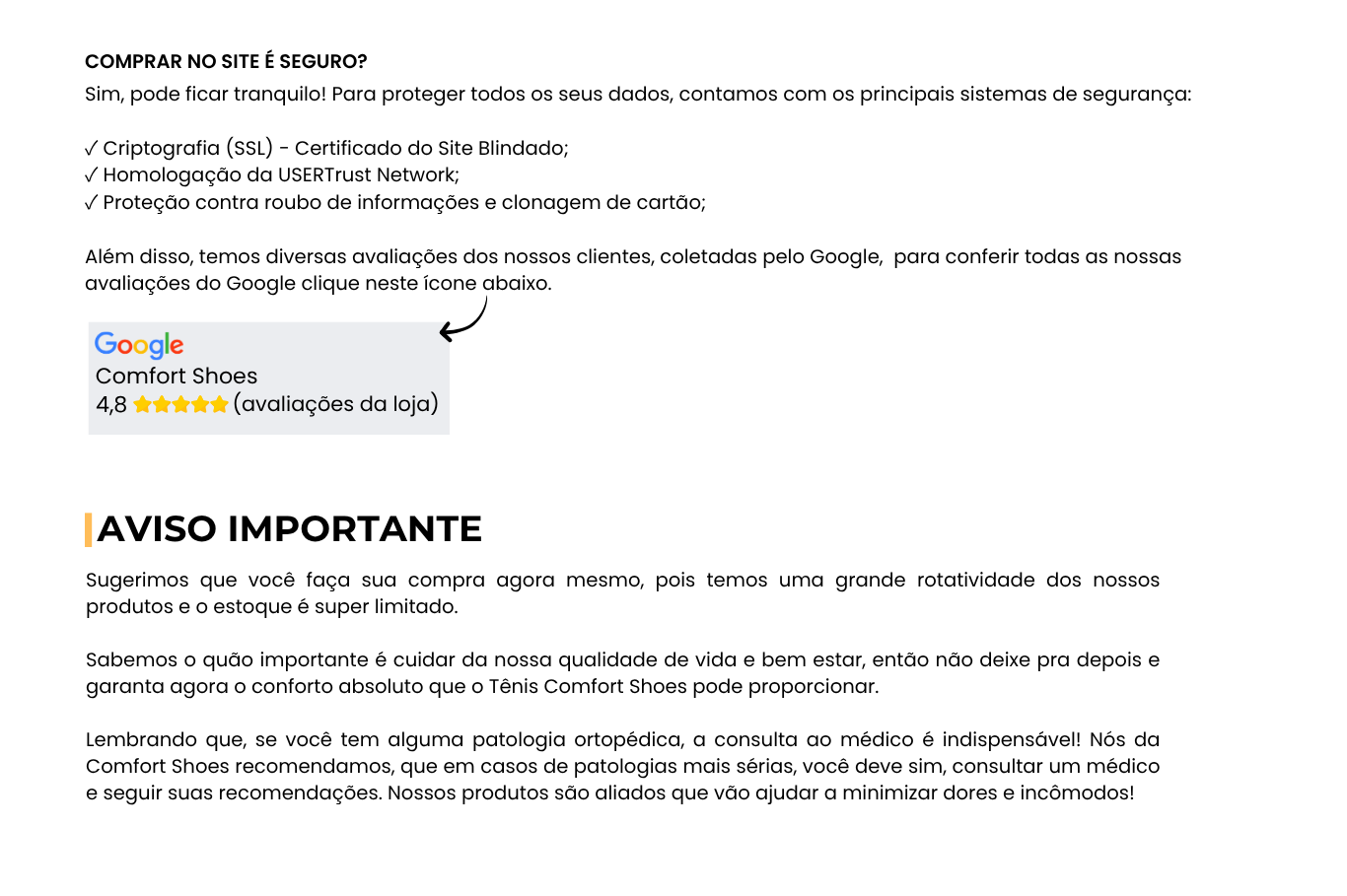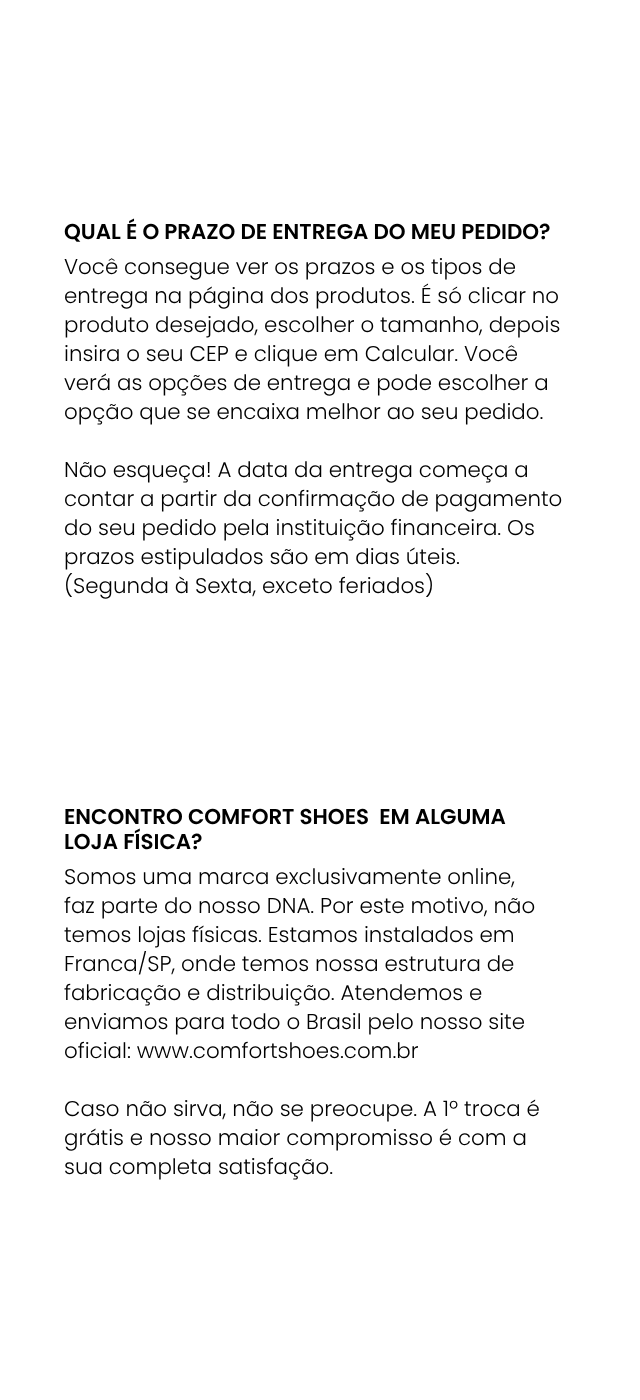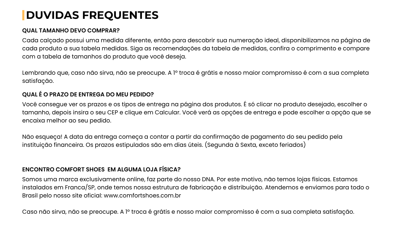 A Comfort Shoes é uma marca focada em oferecer calçados confortáveis e com qualidade Premium. Oferecemos produtos direto da fábrica, produzidos com matérias primas selecionadas e de extrema qualidade. Parcelamos sua compra em até 6x sem juros e enviamos para todo Brasil. Aproveite para fazer sua compra agora! Qualquer dúvida pode nos contatar em nossas centrais de atendimento!